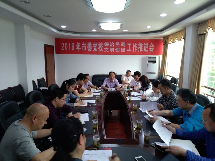 2018年4月3日下午,我校举行2018年度综治民调和文明创建工作推进会,校务委员、机关党委书记肖定舟主持会议,全校各处室(部门)负责人和校创建办工作人员参加。